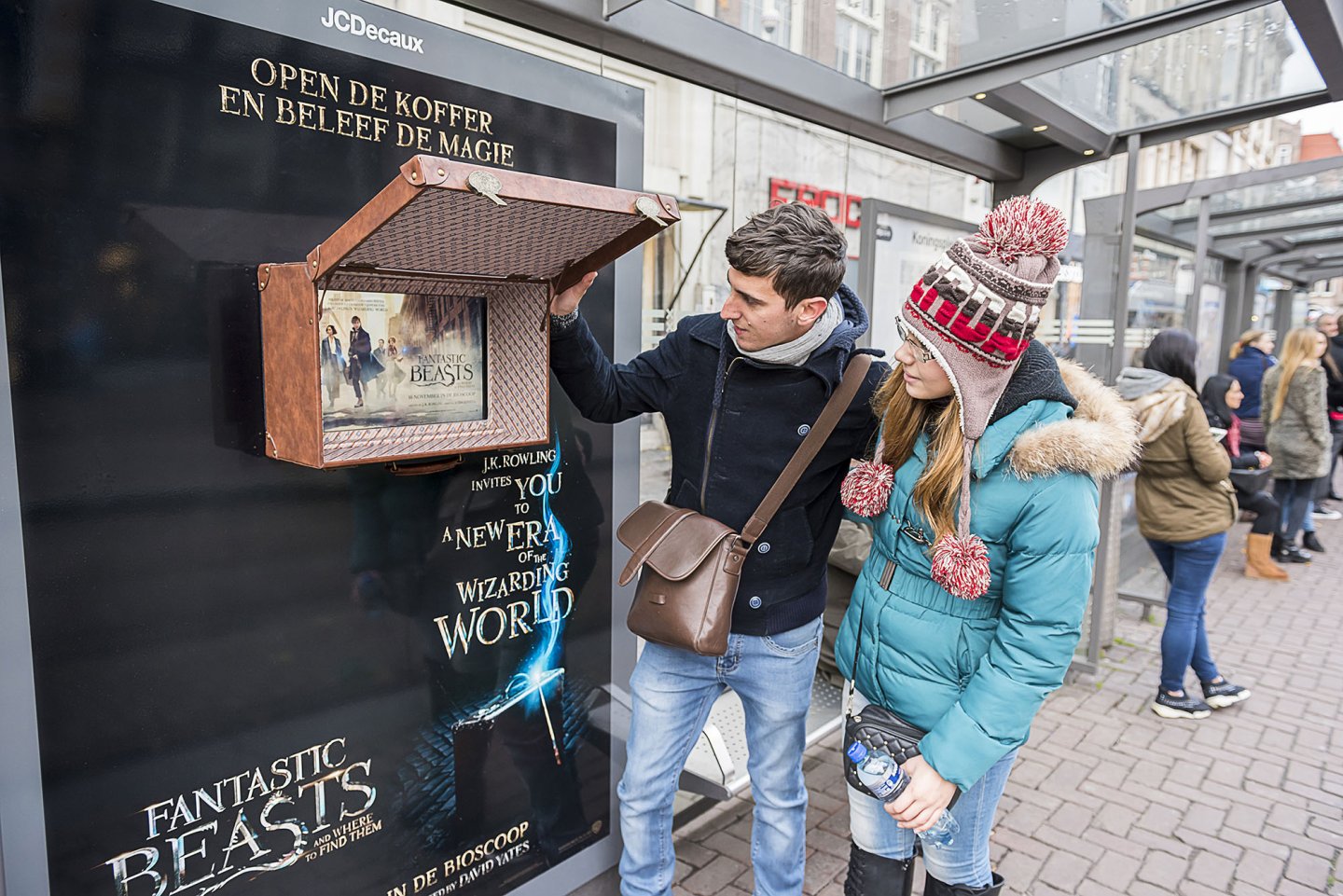 De magische koffer uit Fantastic Beasts and Where to Find Them is te zien in twee Amsterdamse Abri’s. Laten passanten de koffer netjes dicht of nemen ze het risico de fabeldieren te laten ontsnappen?