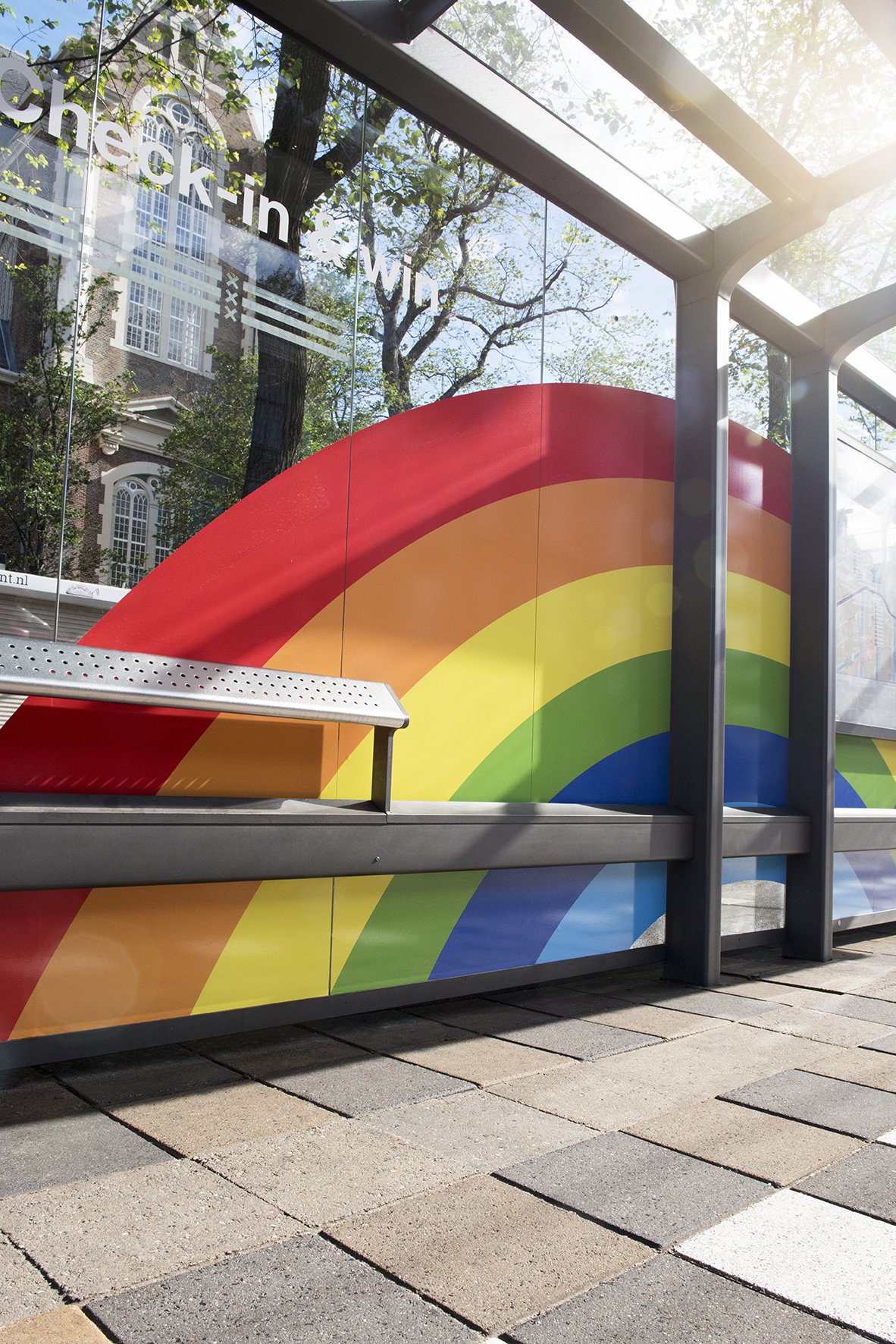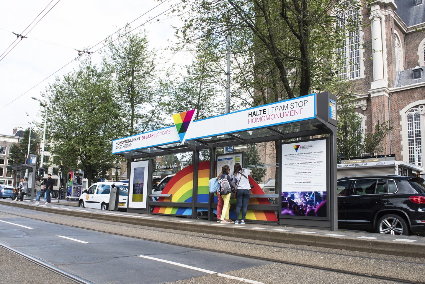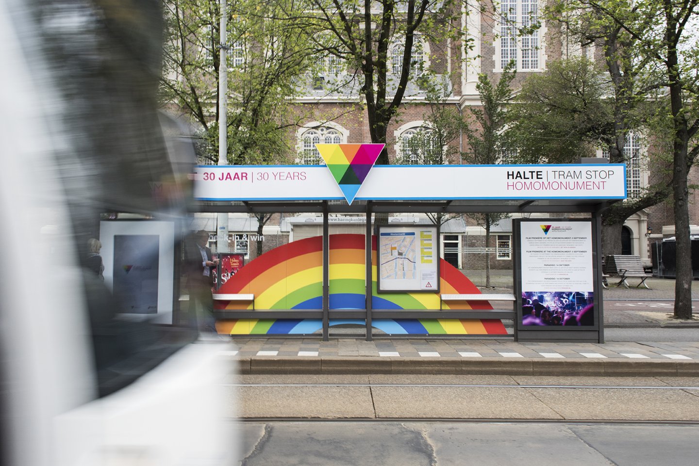 Het Homomonument in Amsterdam bestaat dertig jaar. Om deze mijlpaal te vieren transformeert de Abri op halte Westermarkt de komende zes weken tot een regenboog-Abri.