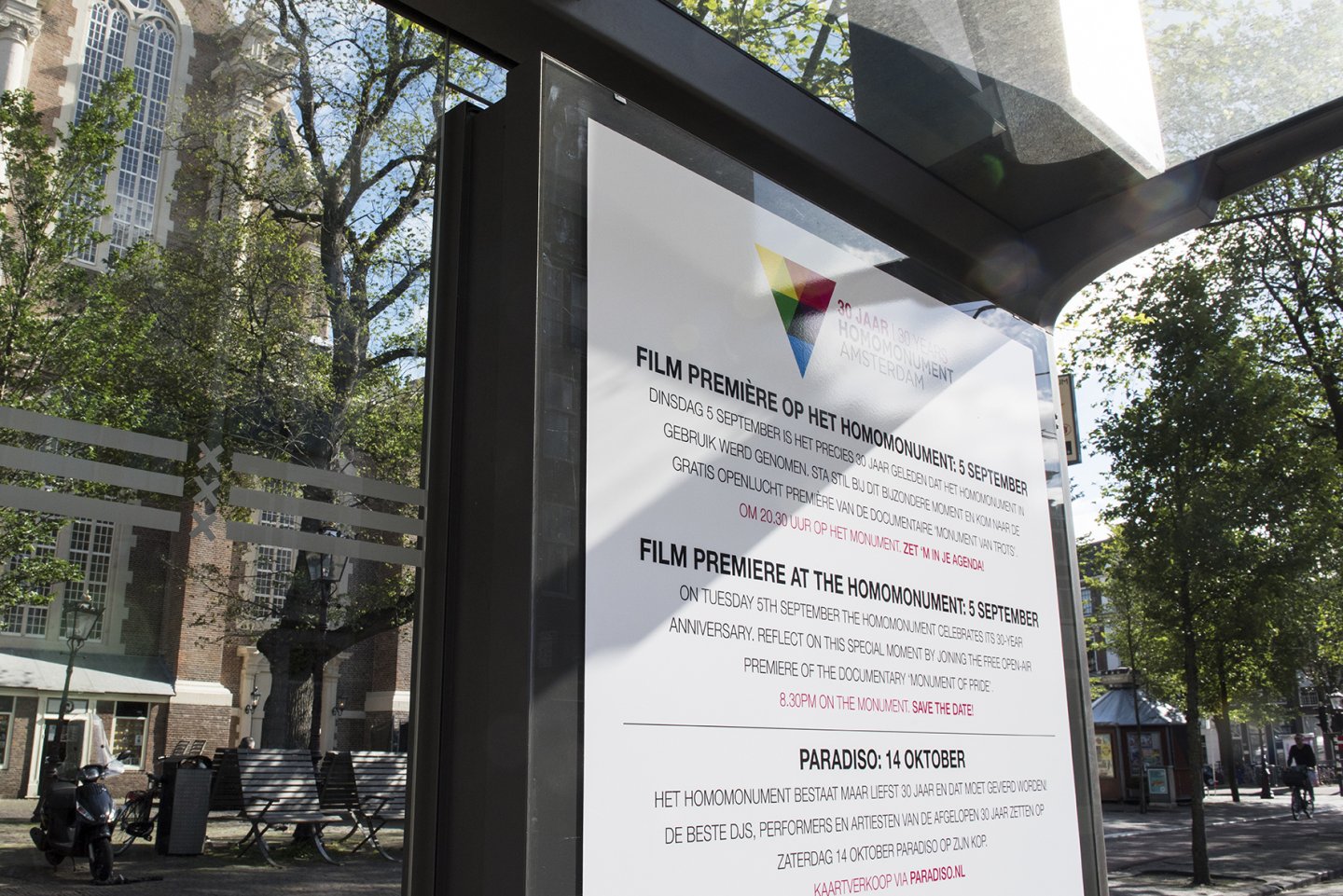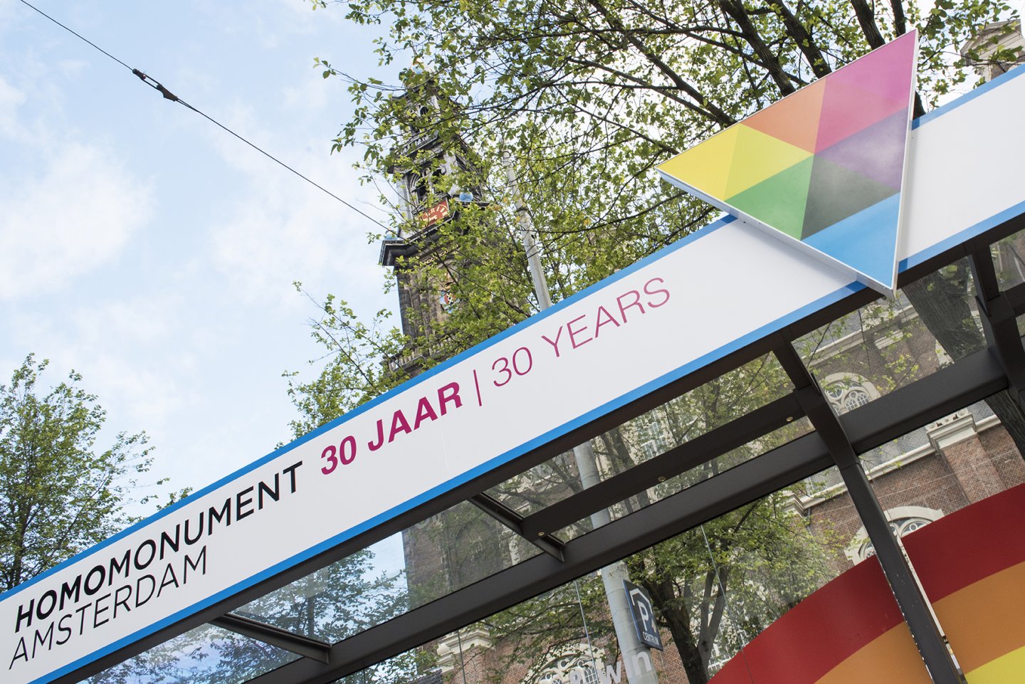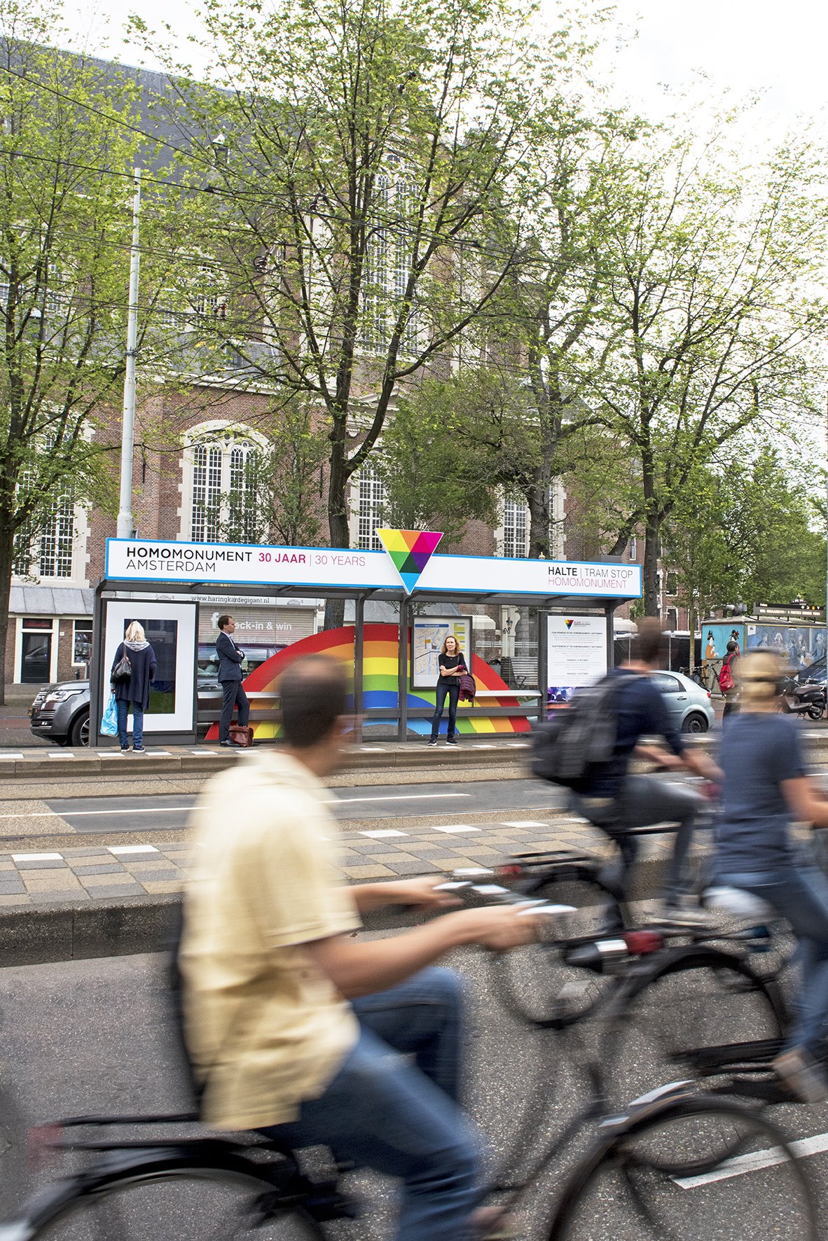 Het Homomonument in Amsterdam bestaat dertig jaar. Om deze mijlpaal te vieren transformeert de Abri op halte Westermarkt de komende zes weken tot een regenboog-Abri.