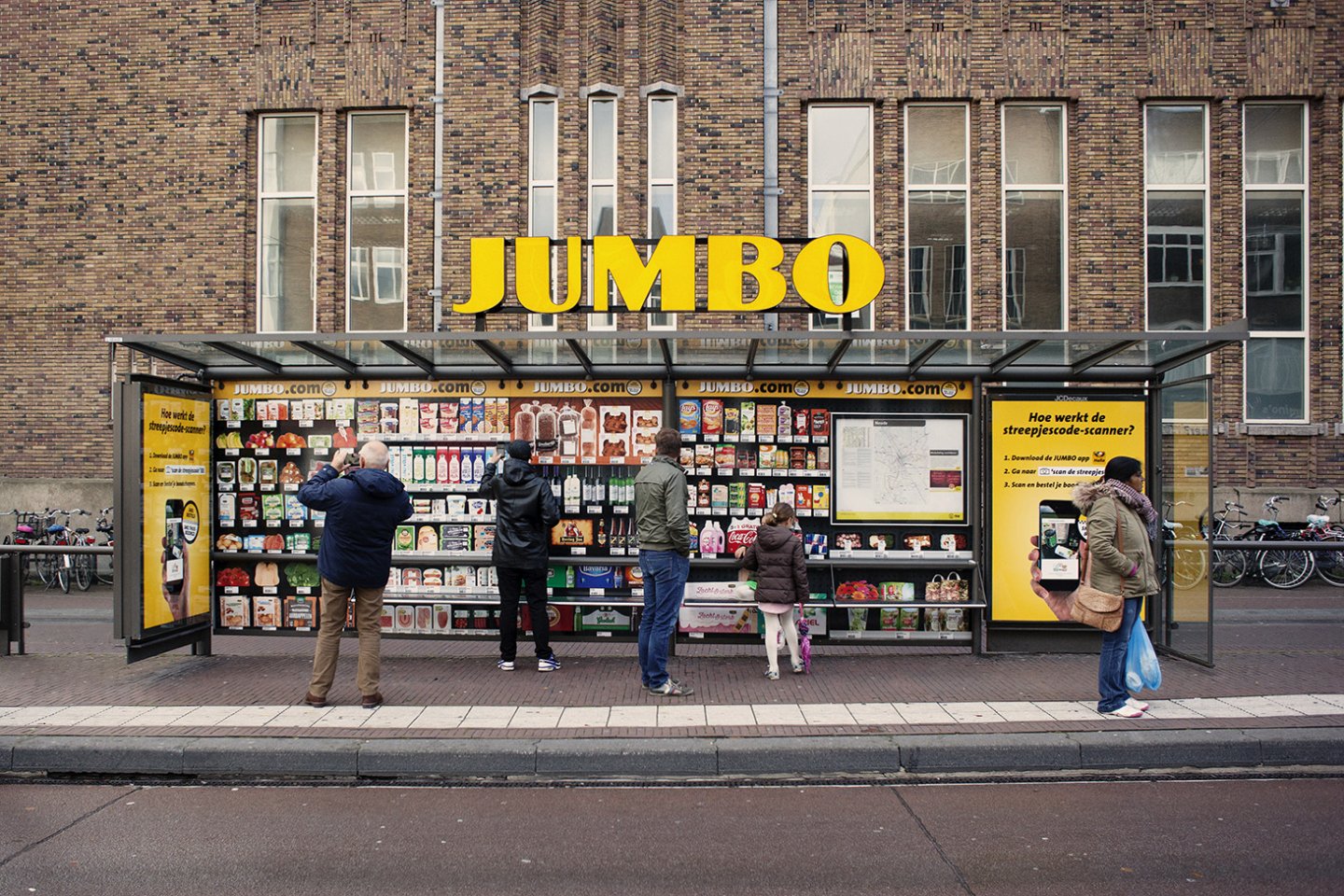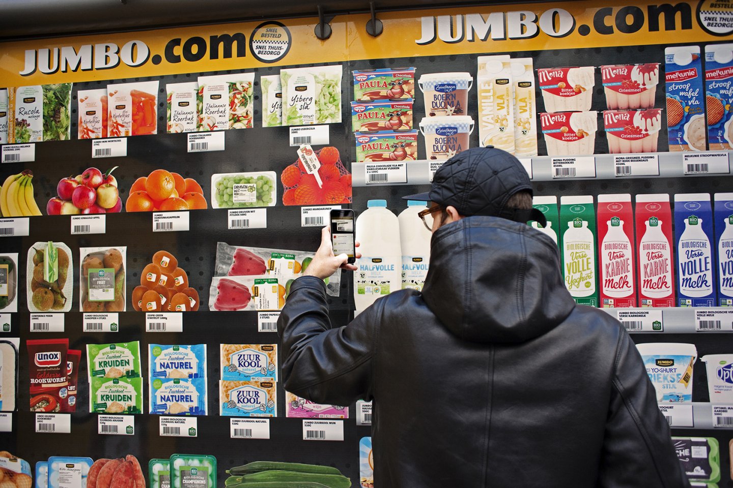 Tijdens het wachten op de bus alvast boodschappen doen: met de vernieuwde app van Jumbo is het mogelijk producten te scannen en te bestellen. Dit concept wordt nu onder andere uitgedragen met een pop-up supermarkt in een Abri van JCDecaux.