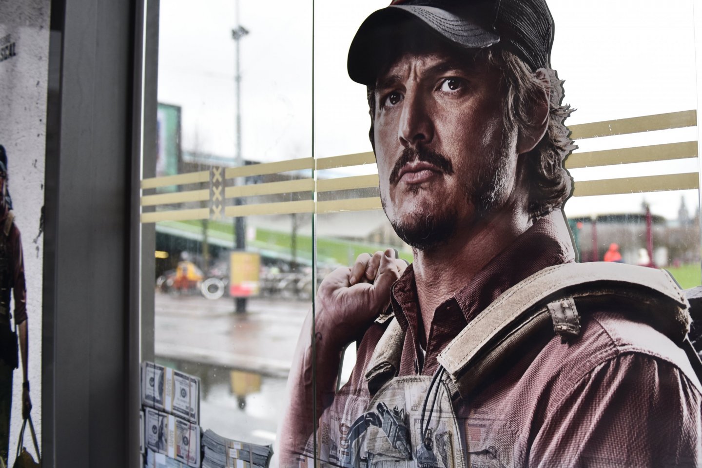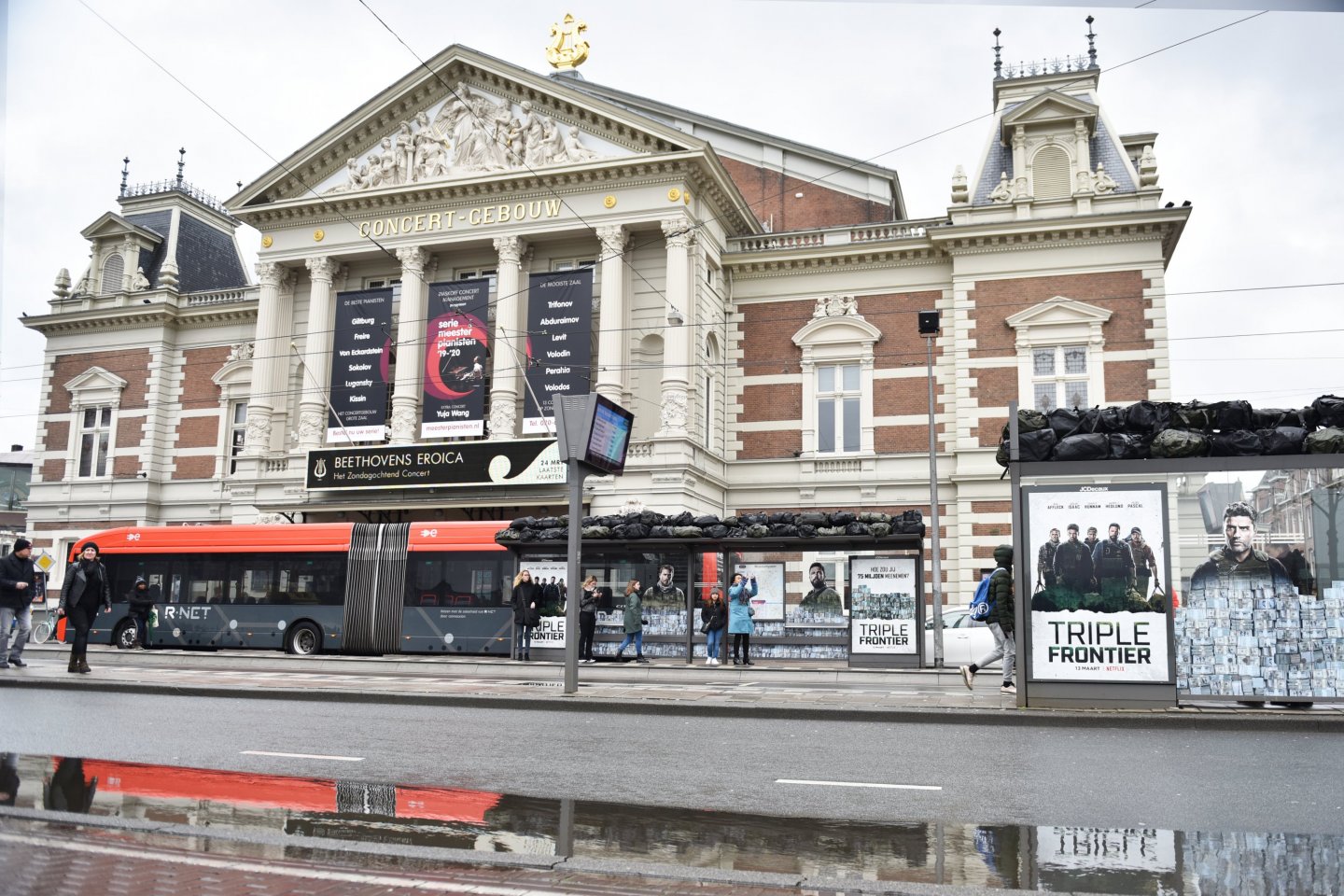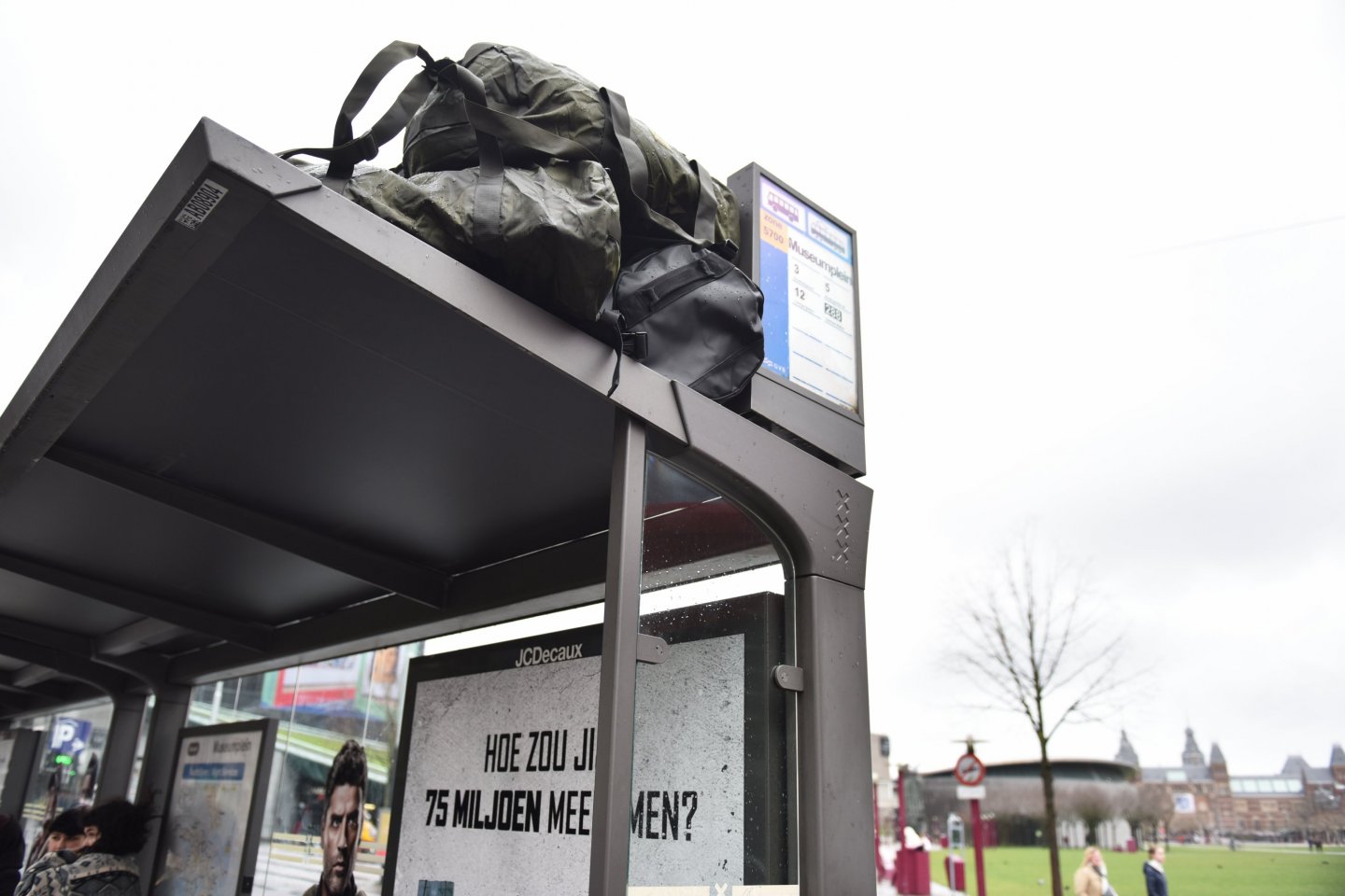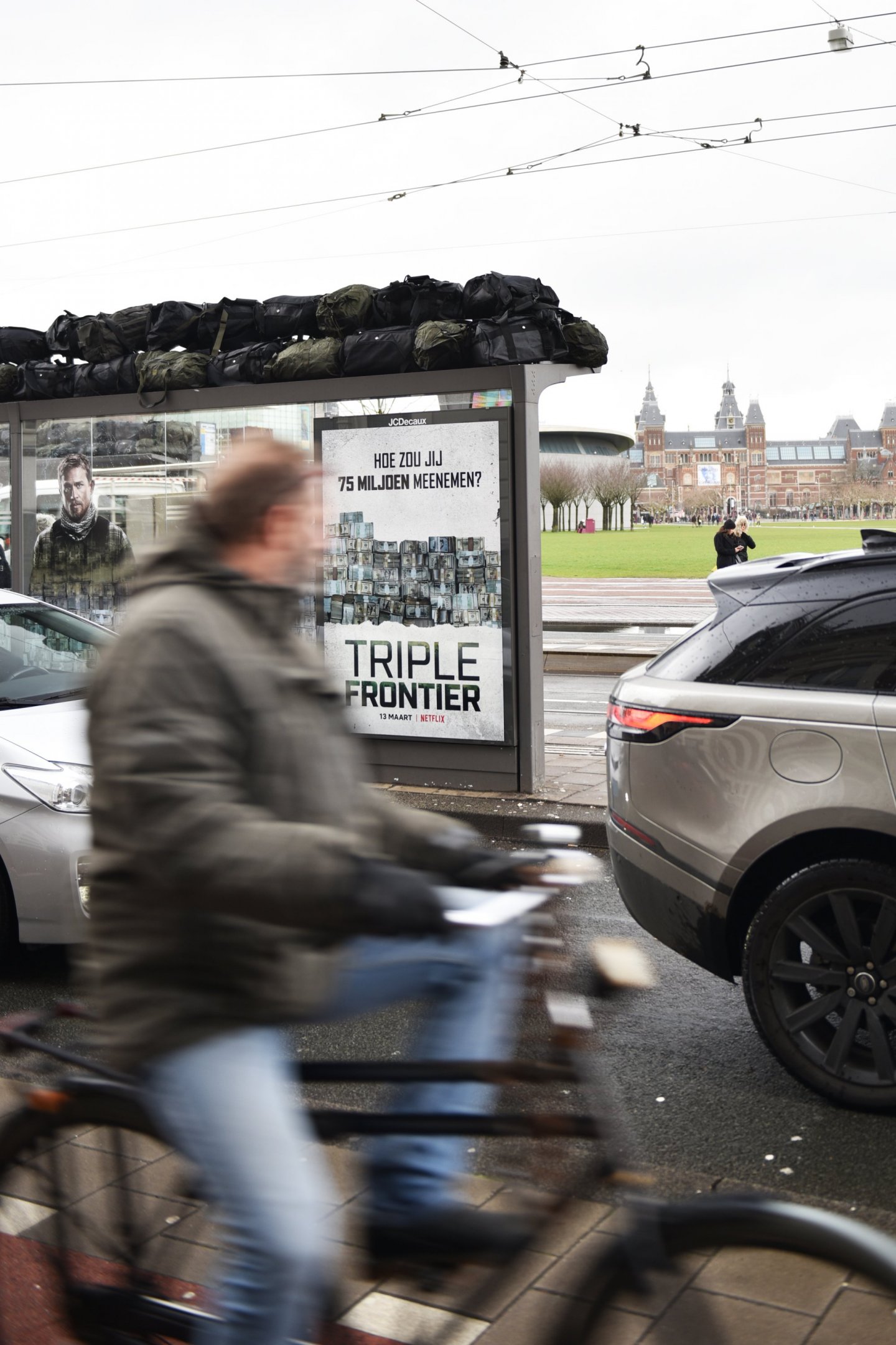 De buit ligt op straat! Honderden gevulde duffle bags liggen opgestapeld op de Abri’s op het Museumplein. Heel even konden we de stress van de mannen uit de topcast van de nieuwe Netflix-Original film: Triple Frontier ervaren...
