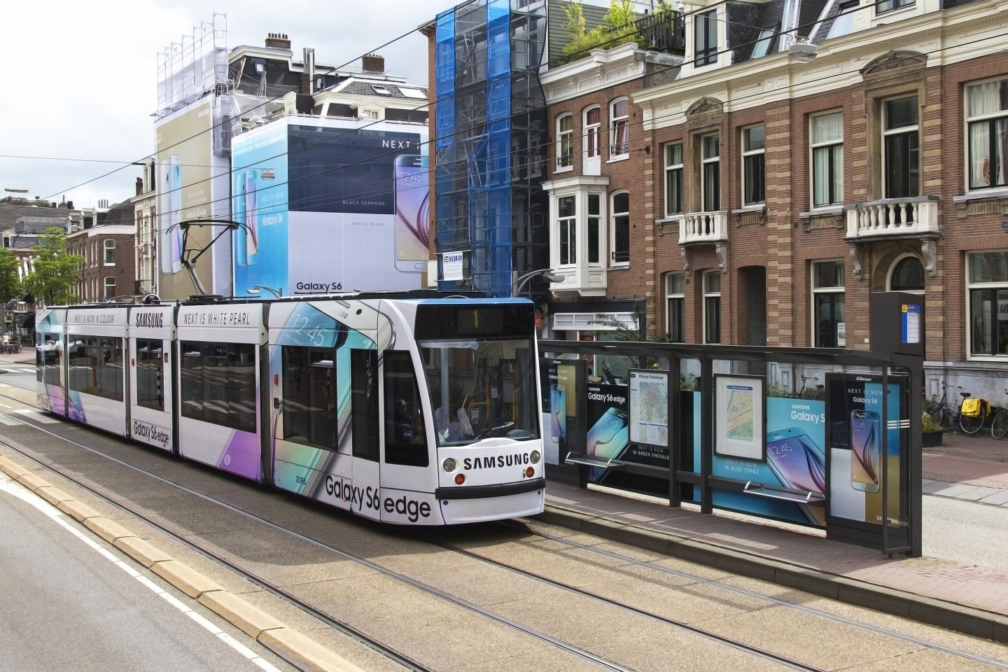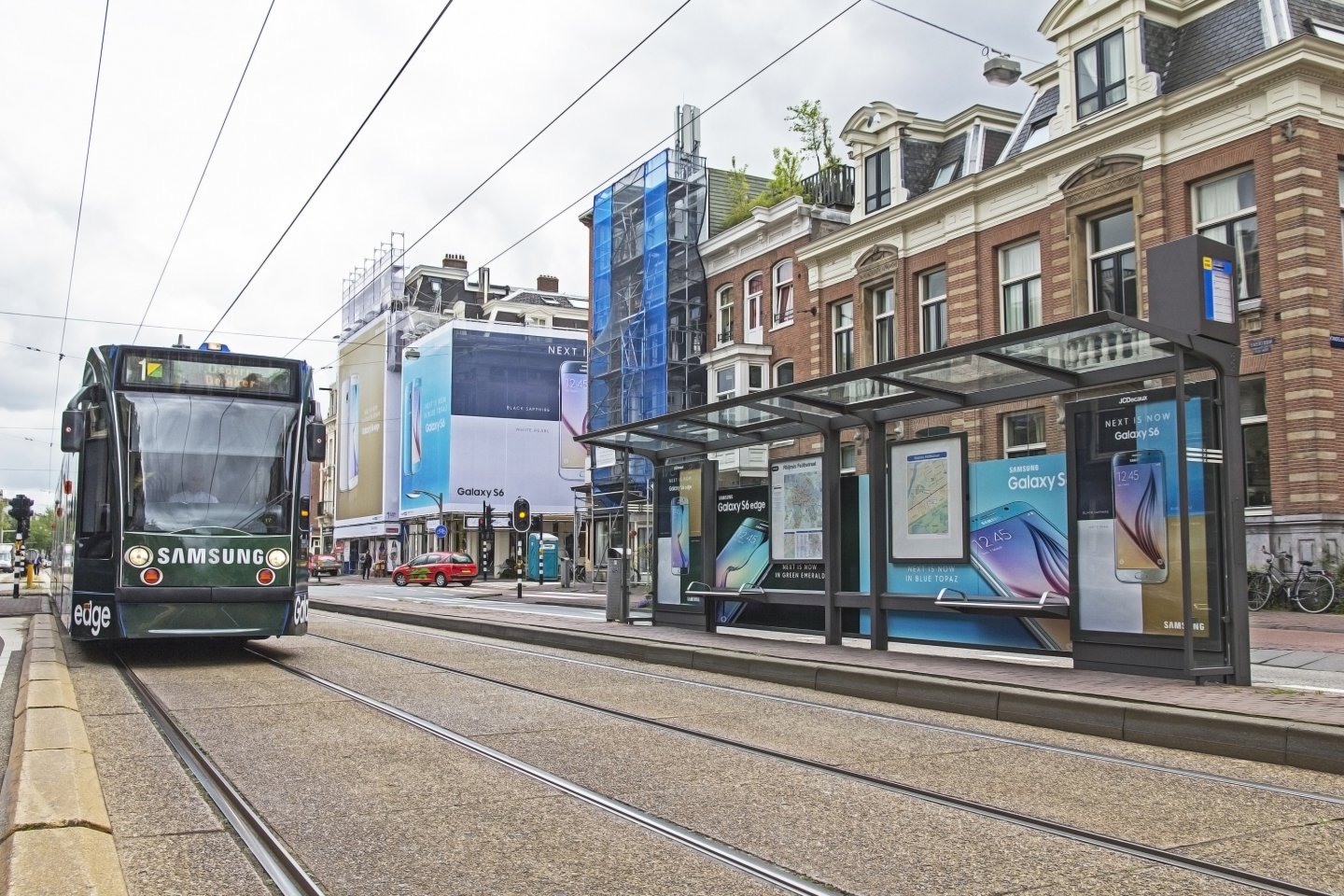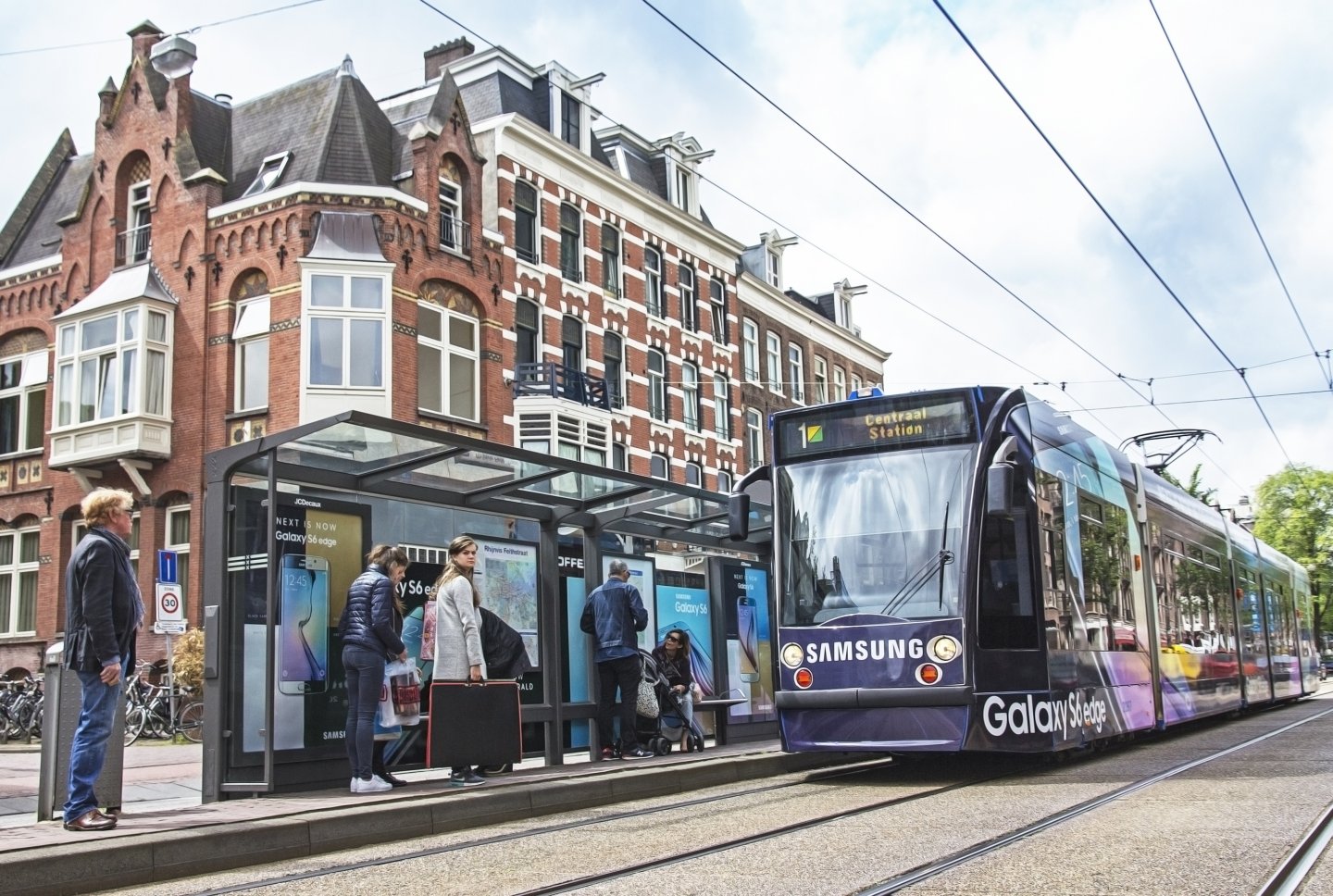 Abri’s, Billboards, Total View Trams, een Special en steigerdoeken… Samsung maakt van de Amsterdamse Overtoom een heuse Samsung Avenue.